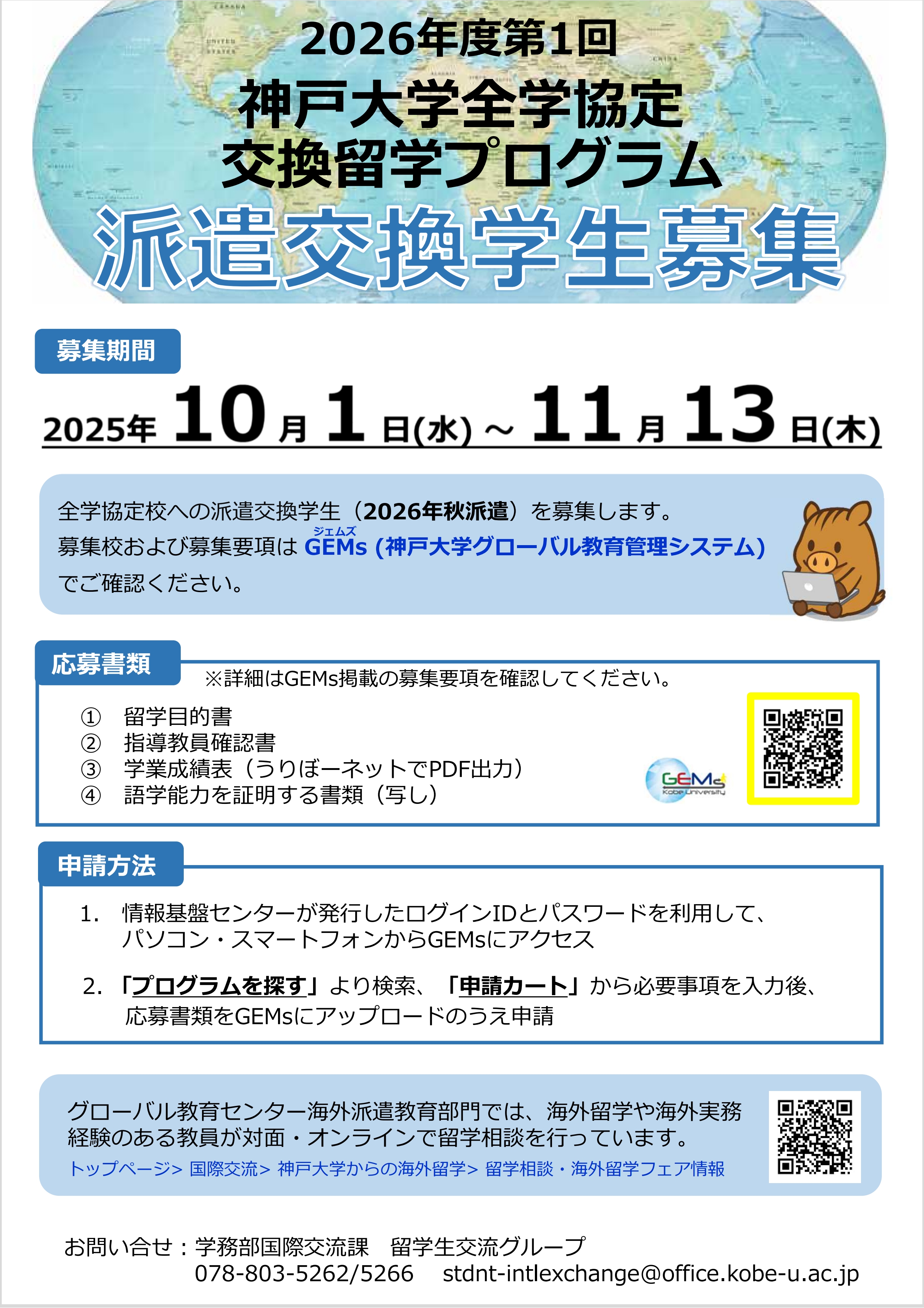 2026年度第1回(2026年秋)全学協定交換留学プログラム派遣交換学生の募集について