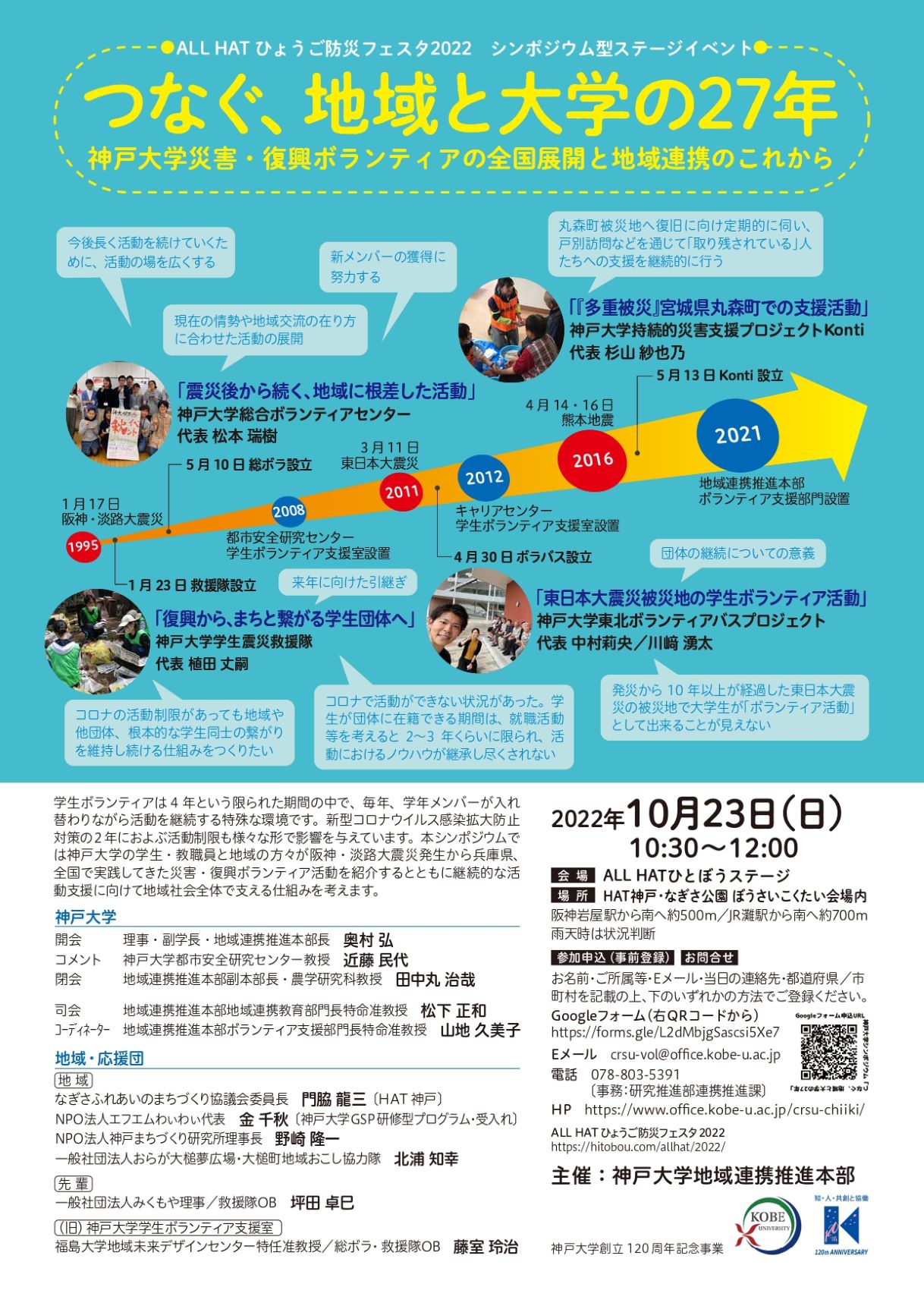 阪神・淡路大震災後、兵庫県から各地の被災地へ活動展開してきた神戸大学・学生ボランティアの経験を皆さんと共有し、これからの大学の取り組み、地域連携、時代で変化する/しない多様なボランティア活動を一緒に考えましょう。