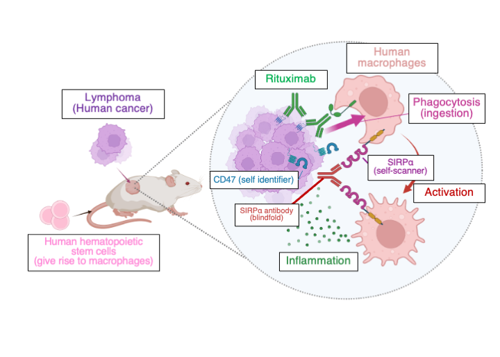 Cancer cells display structures on their surface that identify them as part of the self and thus prevent them from being ingested by macrophages, a type of immune cell. Cancer immunotherapy aims at disrupting these recognition systems. Previous studies showed that a substance that blinds macrophages to one of these identifiers, called “CD47,” by disabling their CD47-scanning structure, “SIRPα,” can activate the cells to fight the tumor when given in combination with therapeutic cancer-targeting antibodies such as Rituximab. However, because this approach is so specific to the self-identification of human cells, until now it could only be tested in humans or monkeys, making pre-clinical studies in mice impossible.