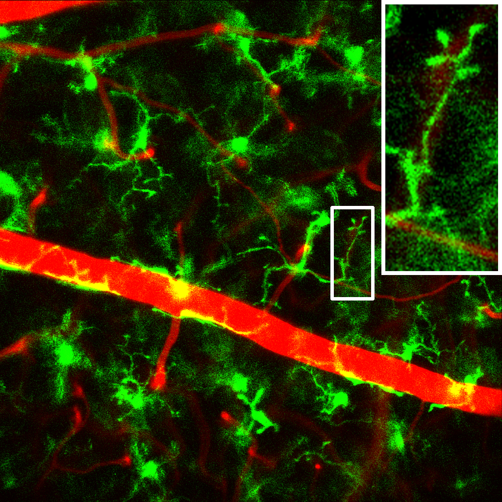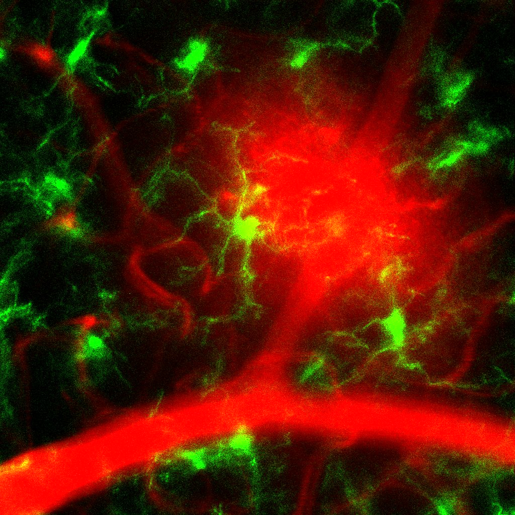 In diabetic mice, blood vessels (red) rupture and their contents leak into the environment. Before such damage occurs, the increased activity of microglia (green) can be observed by the microscopy setup developed by TACHIBANA Yoshihisa and his team. © TACHIBANA Yoshihisa Tachibana, KUSUHARA Sentaro, and SOTANI Noriyuki (CC BY-NC-ND)