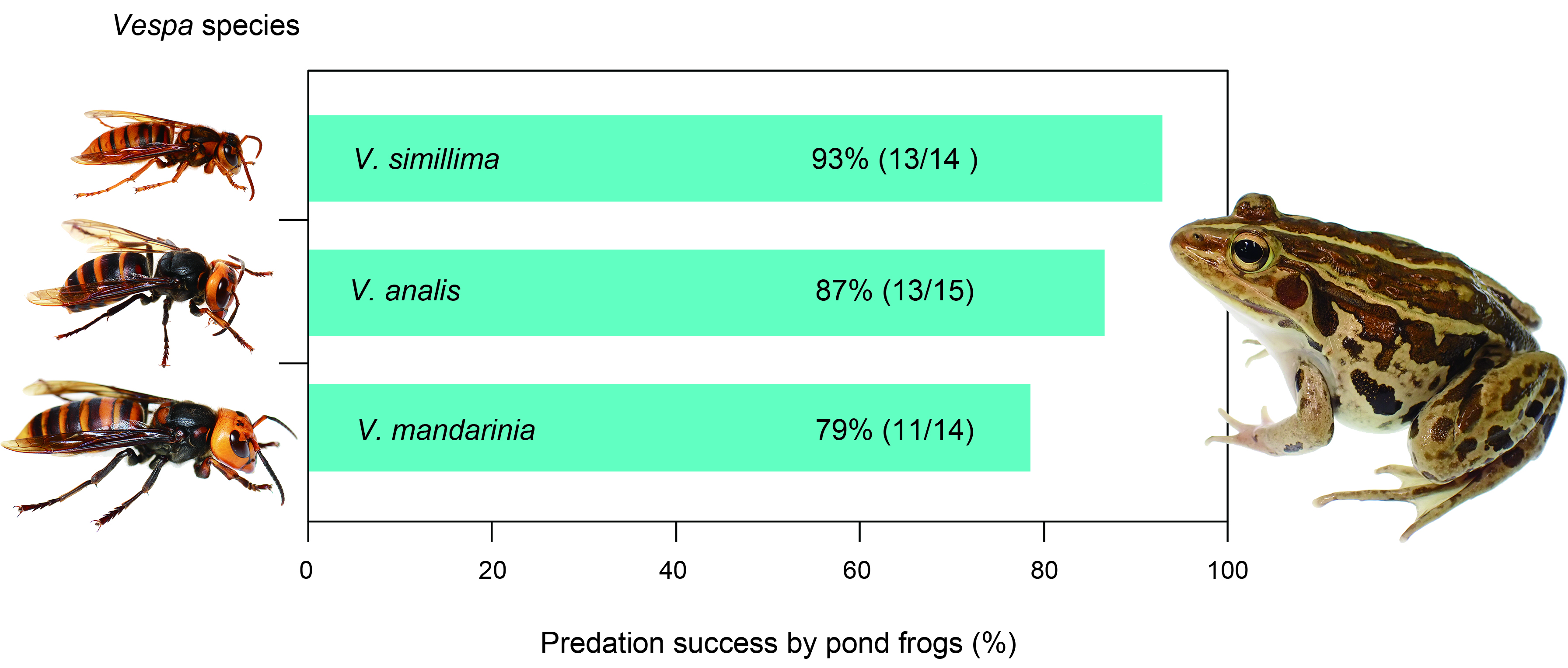 To test whether frogs avoid or tolerate these potentially deadly hornet stings, Sugiura presented individual adult pond frogs with workers of three hornet species, Vespasimillima, V. analis, and V. mandarinia, under laboratory conditions. Each frog was used only once, and was matched to fit the size of their prospective hornet prey, with larger frogs preferentially matched with Asian giant hornet (V. mandarinia) prey.