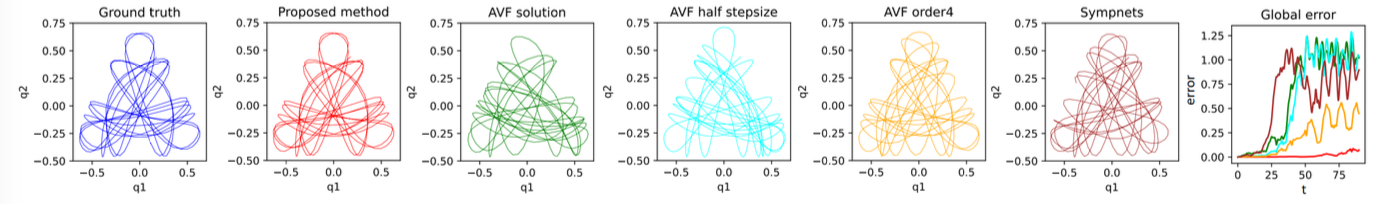 Simulation of the stellar motion in a plane with the Hénon-Heiles model as an example: Compared to various alternative simulation approaches (third to sixth from left), the approach developed by YAGUCHI Takaharu and his team (second from left) is closest to the true long-term behavior of physical systems (leftmost). This can also be seen as the error (rightmost) being smallest (colors in the “global error” plot correspond to colors in the different model plots). © E. Celledoni et al., Advances in Neural Information Processing Systems 2025 (DOI TBD) (CC BY-SA)