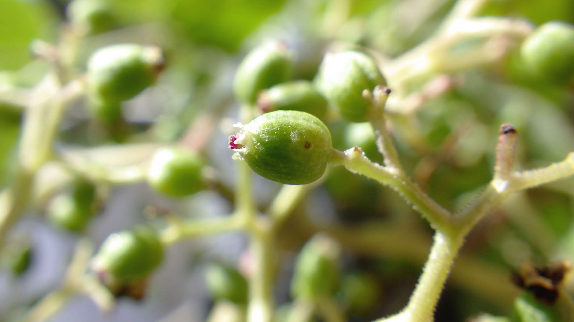 Heterhelus beetles depend on ripening elder fruits, such as those on this Japanese red elder, as cradles for their larvae. The round scar shows where the larva entered the fruit. © KAWASHIMA Suzu (CC BY)