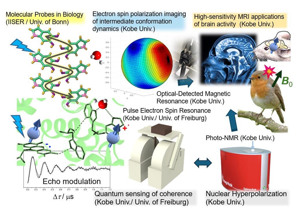 Our international collaboration focuses on three key research themes: (1) magnetoreception mechanisms, (2) spin-mediated photon up-conversion and (3) molecular vibrations governing spin dynamics in multi-qubit systems. These spin-based sensing technologies are directly applicable to magnetic field-based quantum sensing in biological environments.