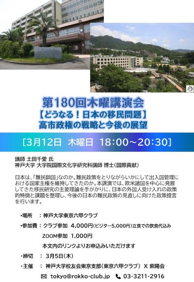 【東京六甲クラブ 第180回木曜会講演会 「どうなる!日本の移民問題:高市政権の戦略と今後の展望」のご案内 3月12日(木)】