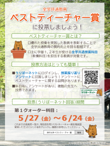 また、平成22年度から毎学期、このアンケートでの推薦をもとに、全学共通授業科目の中で教育上優れた授業を行った教員に対して、「全学共通教育ベストティーチャー賞」を授与しています。(令和3年度後期の実施結果 )