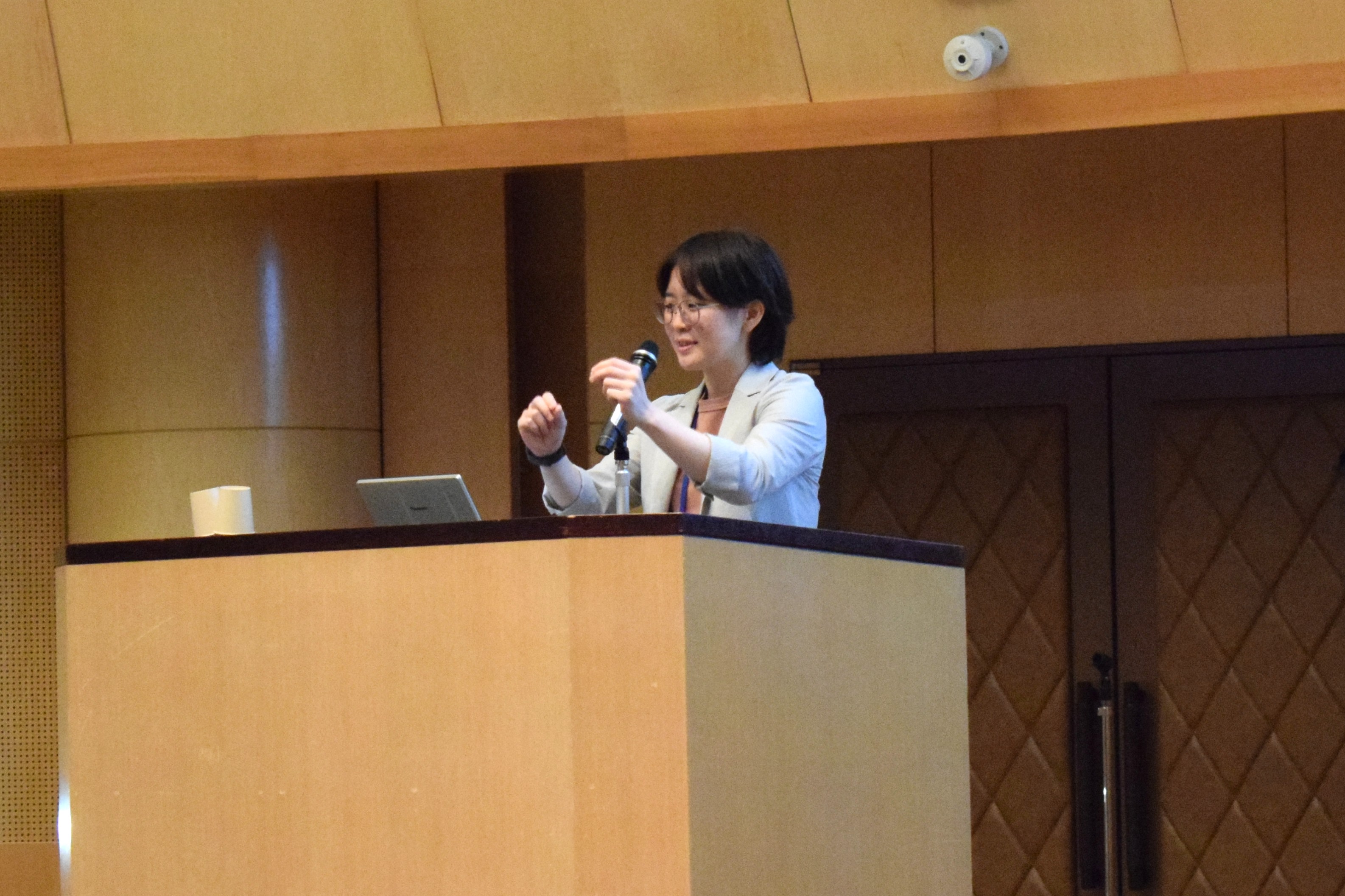 第一部研究報告の後半は、神戸大学若手教員による報告で、最初の報告は大西鮎美助教(神戸大学大学院工学研究科)による「ウェアラブルコンピューティングの研究事例 ~身近な困りごとや自分の特技を起点とした挑戦〜」という報告でした。大西助教が研究を進めるウェアラブルコンピューター(着用出来るコンピュータ)に関する具体例の紹介がありました。唾液を出す装置や、疲れを感知する五感拡張デバイスなど、「コンピュータは着る時代」と話す大西助教に、聴講者は食い入るように聞いていました。