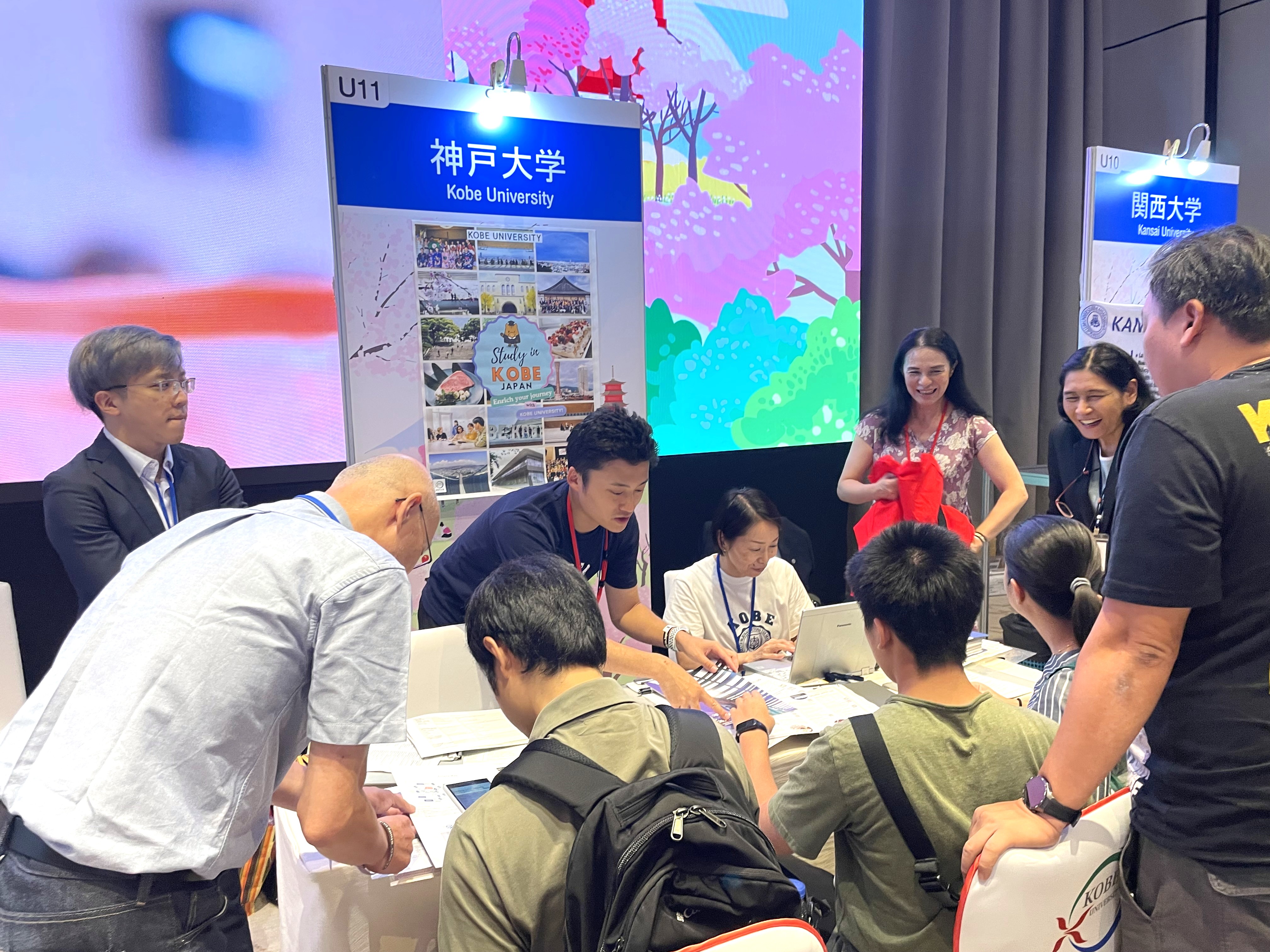 9月7日にハイアットリージェンシー・バンコクスクンビットで開催された日本への留学説明会では神戸大学ブースを出展し、本学への留学経験がある学生スタッフのサポートを得ながら、日本への留学を検討している現地学生等へ本学の紹介を行いました。留学説明会にはイベント全体で820名の参加があり、本学ブースにも80名以上の学生が訪れ、本学での生活や授業、奨学金等の経済支援制度など、多岐にわたる質疑応答が行われました。