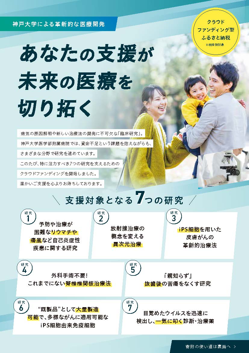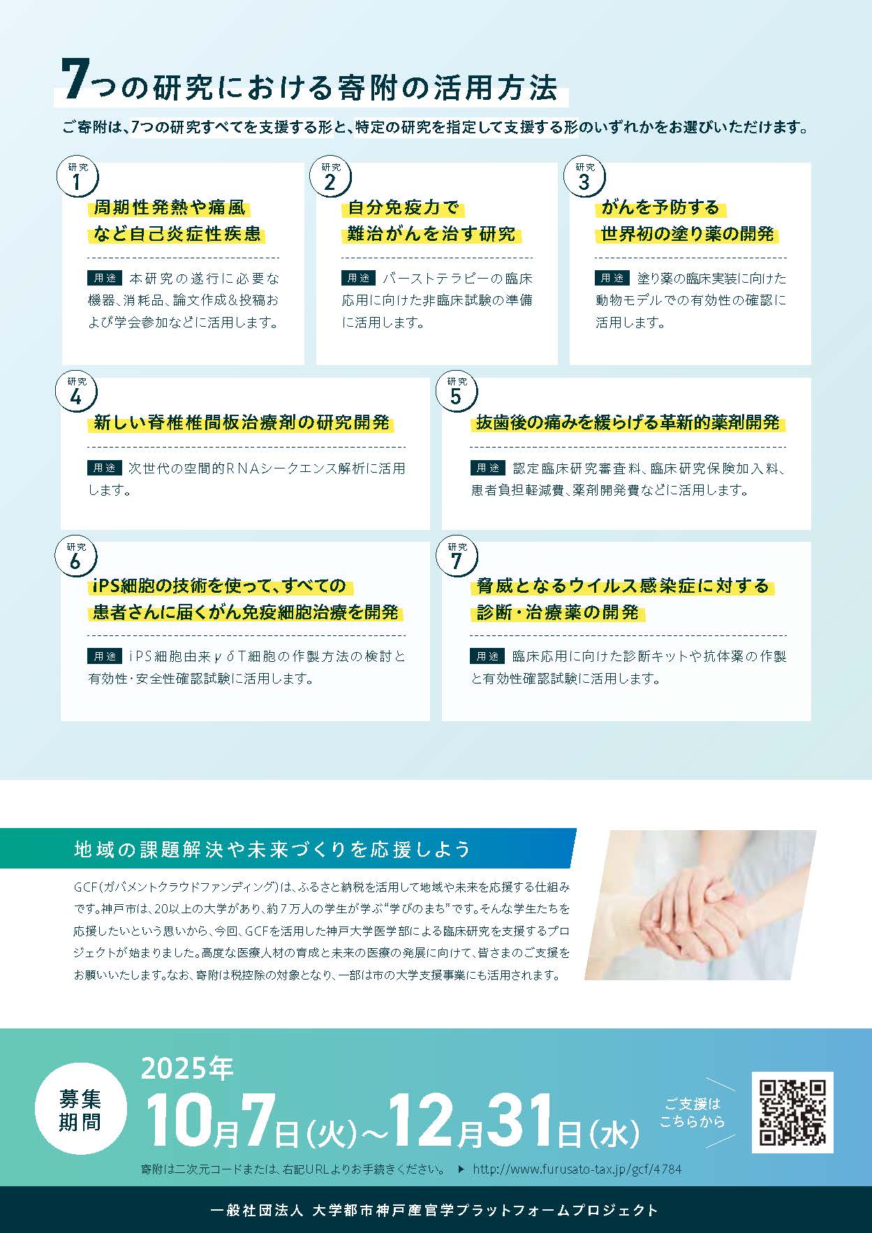 「神戸大学が取組む、革新的な治療法・治療薬の開発」をテーマに7つの研究に対してクラウドファンディングが開始されましたので、皆様の温かいご支援を心よりお待ちしております。