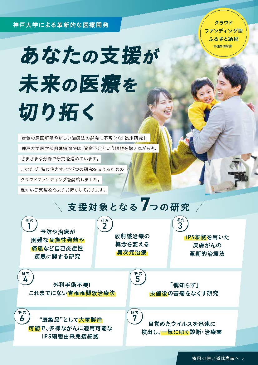 「神戸大学が取組む、革新的な治療法・治療薬の開発」をテーマに7つの研究に対してクラウドファンディングが開始されましたので、皆様の温かいご支援を心よりお待ちしております。