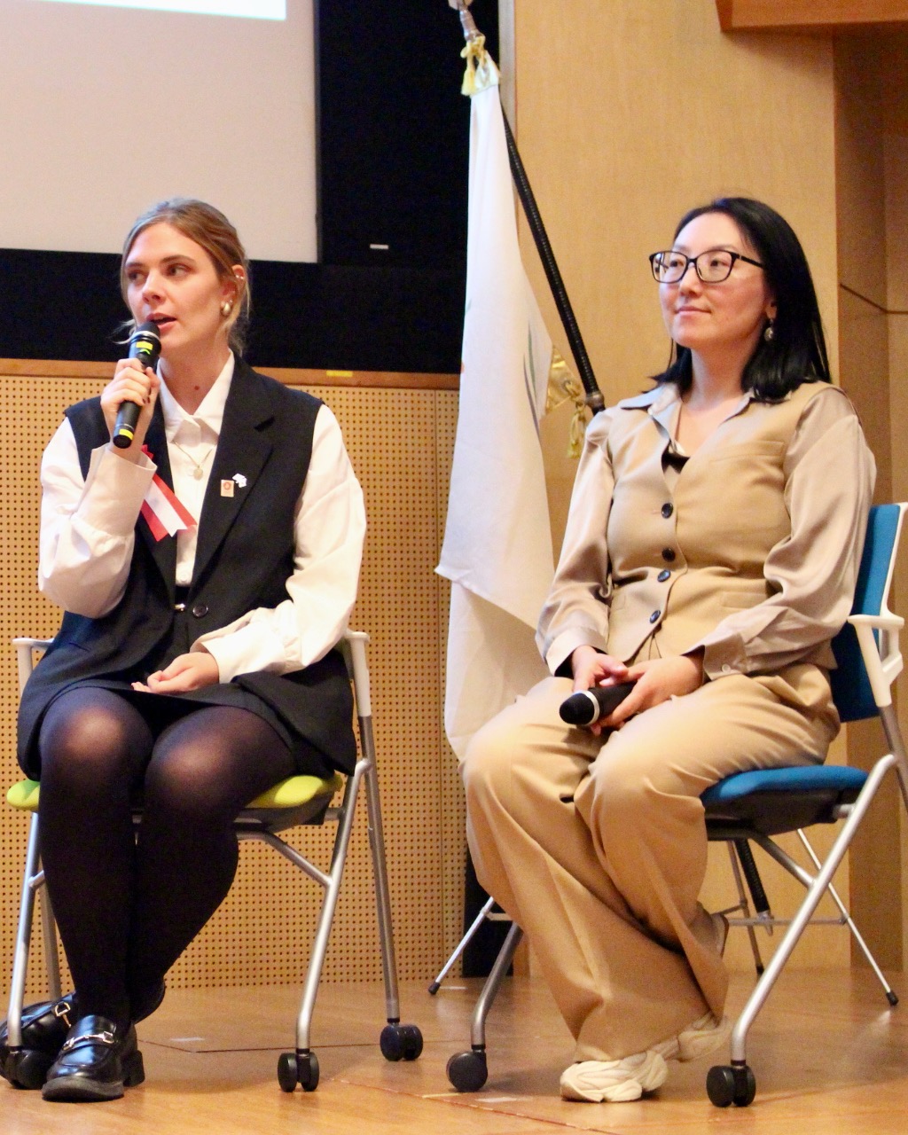メイン企画「ようこそ先輩!神戸大学へ」では、「卒業留学生が語る大阪万博2025〜世界と日本の架け橋に〜」をテーマに、2名の卒業生が登壇しました。登壇者は、駐日キルギス共和国特命全権大使令夫人であるソルトバエヴァ・ジャミリャさん(日本語・日本文化研修留学生2006年修了)と、ポルトガル館のPRアシスタントを務めたボーラウフ・サンドラさん(日本語・日本文化研修留学生2016年修了)です。お二人は、それぞれの立場から大阪・関西万博に対する思いや、国際交流の可能性について語りました。講演後には、グローバル教育センターの朴鍾祐教授を聞き手に迎え、「万博おしゃべりトーク」と題した座談会が行われ、3名による自由な対話を通じて、万博に込められた想いや期待がより深く共有されました。