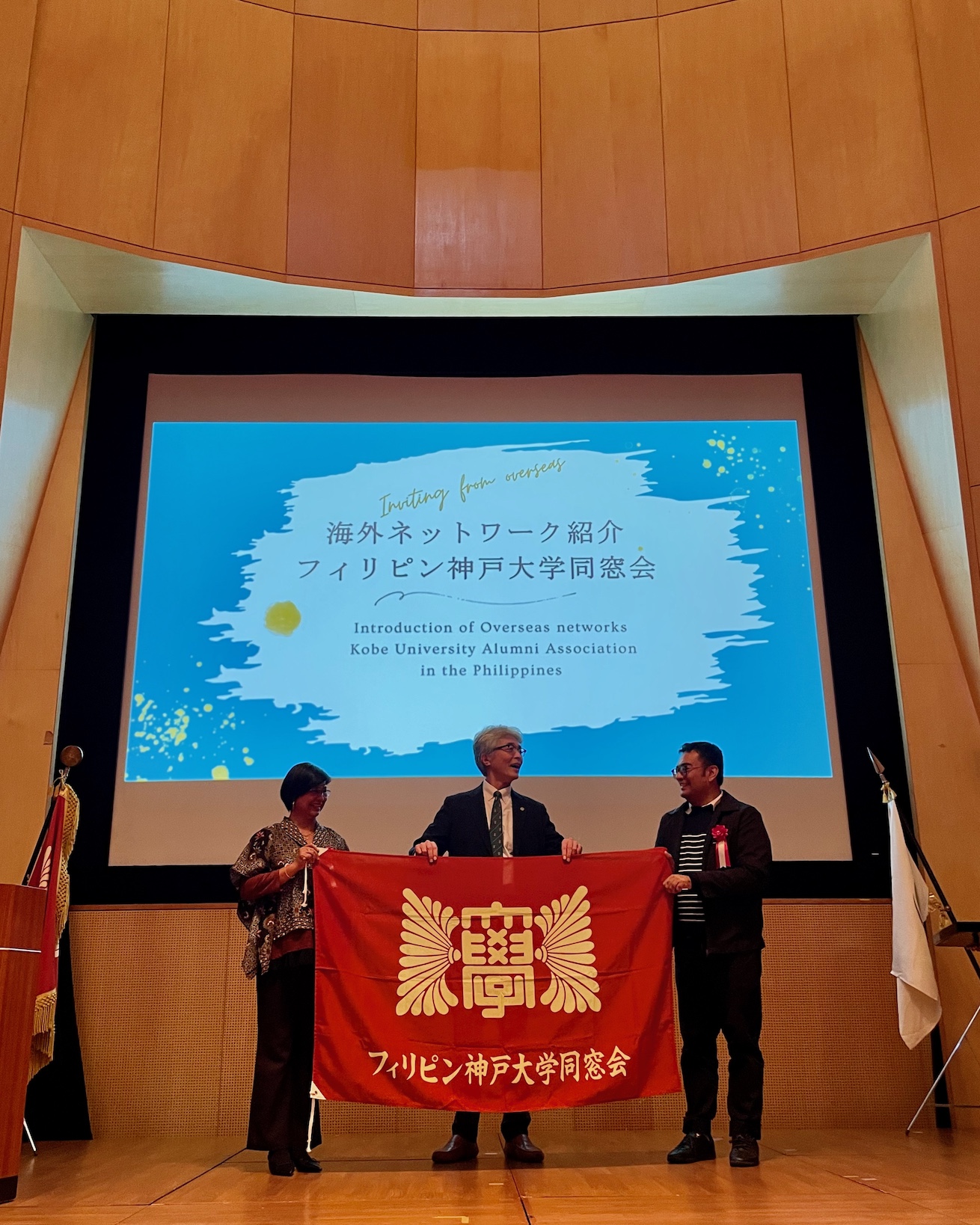 続いて行われた「海外ネットワーク紹介」では、まずグローバル教育センターの川上尚恵准教授が、本学の海外ネットワークについて説明を行いました。その後、今年2月に発足した「フィリピン神戸大学同窓会」について、会長を務めるパリヤ・ヴェイシエル・ゲイさん(医学研究科2008年修了)より紹介がありました。続いて、幹事のアルヴィン・カルロ・ガルシア・タピアさん(理学研究科2013年修了)が、神戸大学とフィリピンの卒業生をつなぐ絆を感じさせる、躍動感あふれるスライドを披露しました。