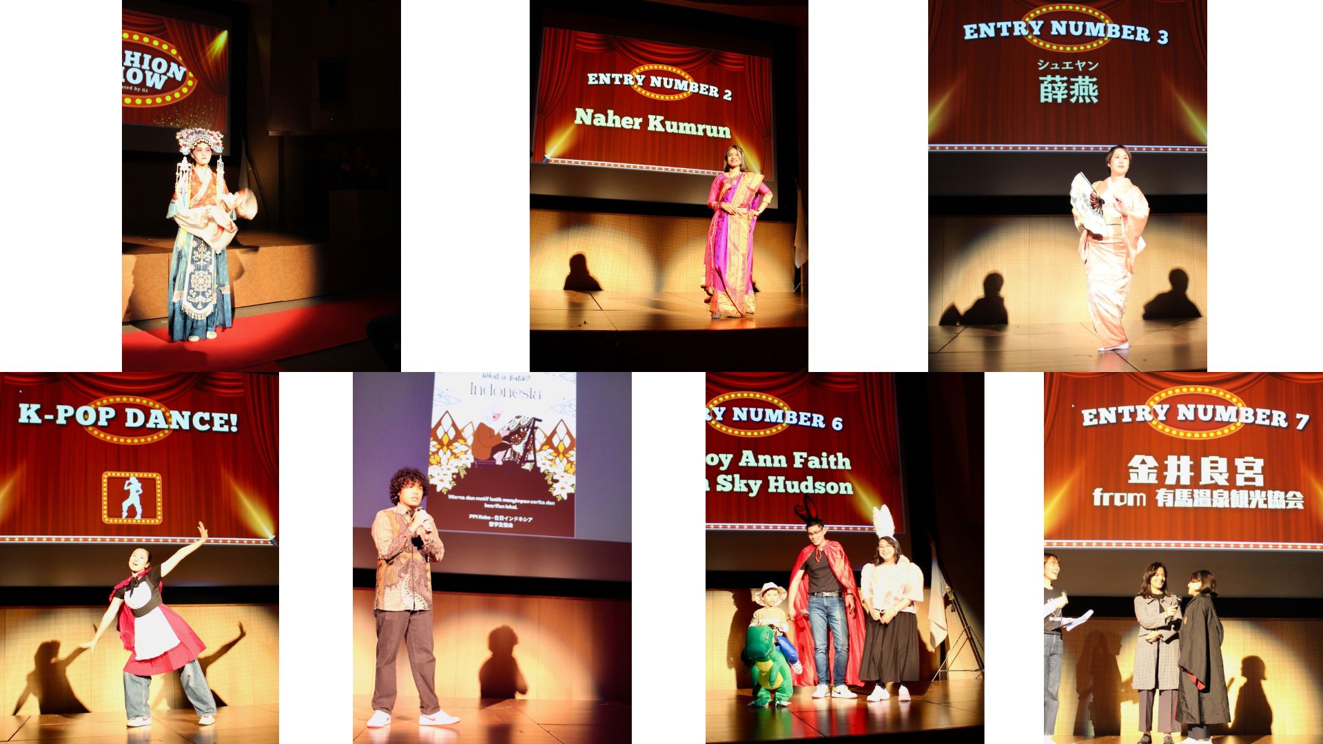 さらに、今年の「KUワールドフェスタ」では、神戸大学生協学生委員会(GI)が企画した留学生によるハロウィンファッションショーが開催されました。ショーには、5か国からの在学留学生が参加し、チン・ダンヨウさん(法学研究科)、Pornpimol Chaiboontaさん(保健学研究科)、May Jungさん(保健学研究科)、Naher Kumrunさん(国際協力研究科)、そしてフェイス・タンさん(国際文化学研究科)が、それぞれの個性を活かした衣装で登場し、歌の披露も行われました。また、現役学生だけでなく、卒業留学生の家族も参加し、イベントを盛り上げました。中国人卒業留学生の薛燕さん(総合人間科学研究科2008年修了)は親子で参加し、優雅な和装姿で20年以上にわたり続けている日本舞踊を披露しました。さらに、有馬温泉「御所別墅」のブランドディレクターを務める金井良宮さん(工学部2005年卒業)親子も登場し、六甲から山を越えてすぐの有馬温泉ならではの温泉文化について美しい映像を交えながら紹介してくれました。会場には、本学公式マスコットキャラクター「神大うりぼー」が特別ゲストとして登場し、来場者を楽しませました。GIメンバーによるお菓子配りの演出もあり、ハロウィンらしい賑やかなひとときとなりました。