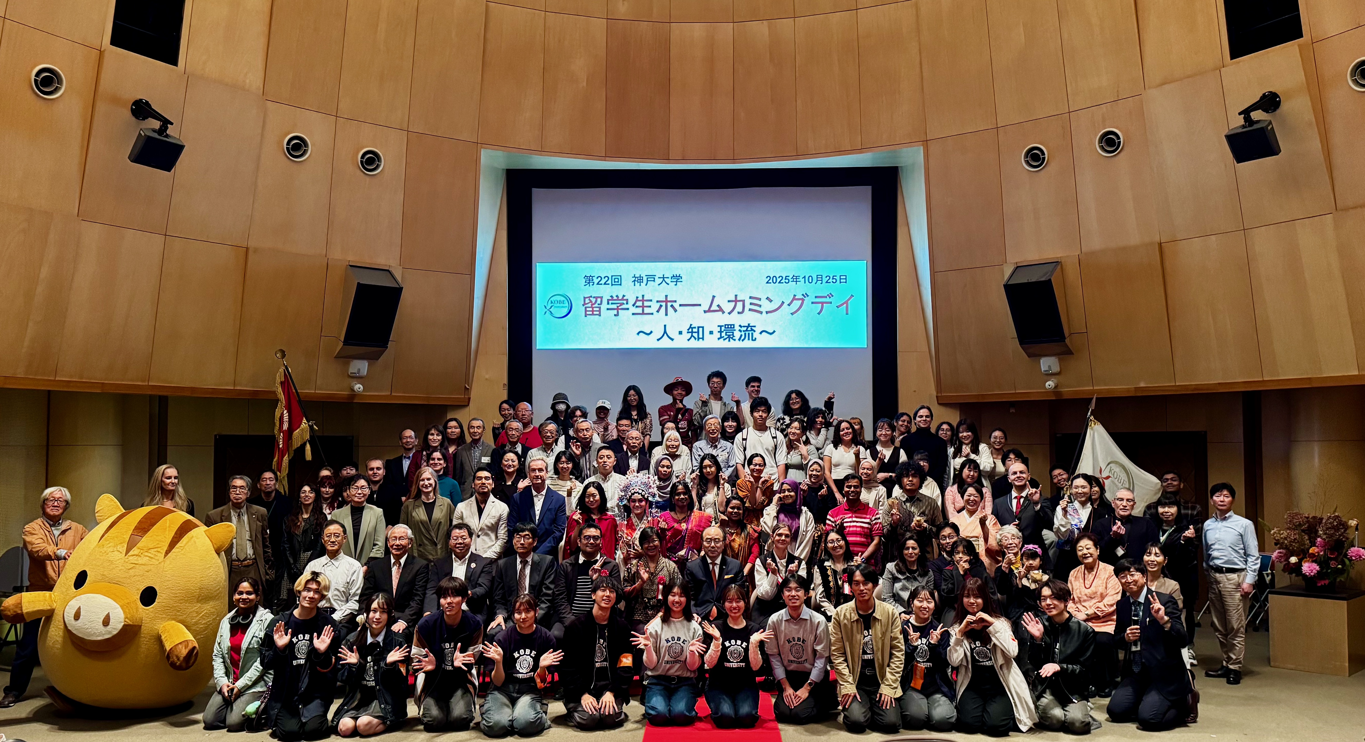 2025年10月25日、第22回留学生ホームカミングデイを六甲ホールにて開催しました。当日は、修了生のヘリニャン・アンドレイ・マリャンさん(人文学研究科2022年修了)と、在学中の留学生バルジンニャム・ハジドツェツェクさん(経営学部)が司会を務め、日英バイリンガルの司会で進行されました。
