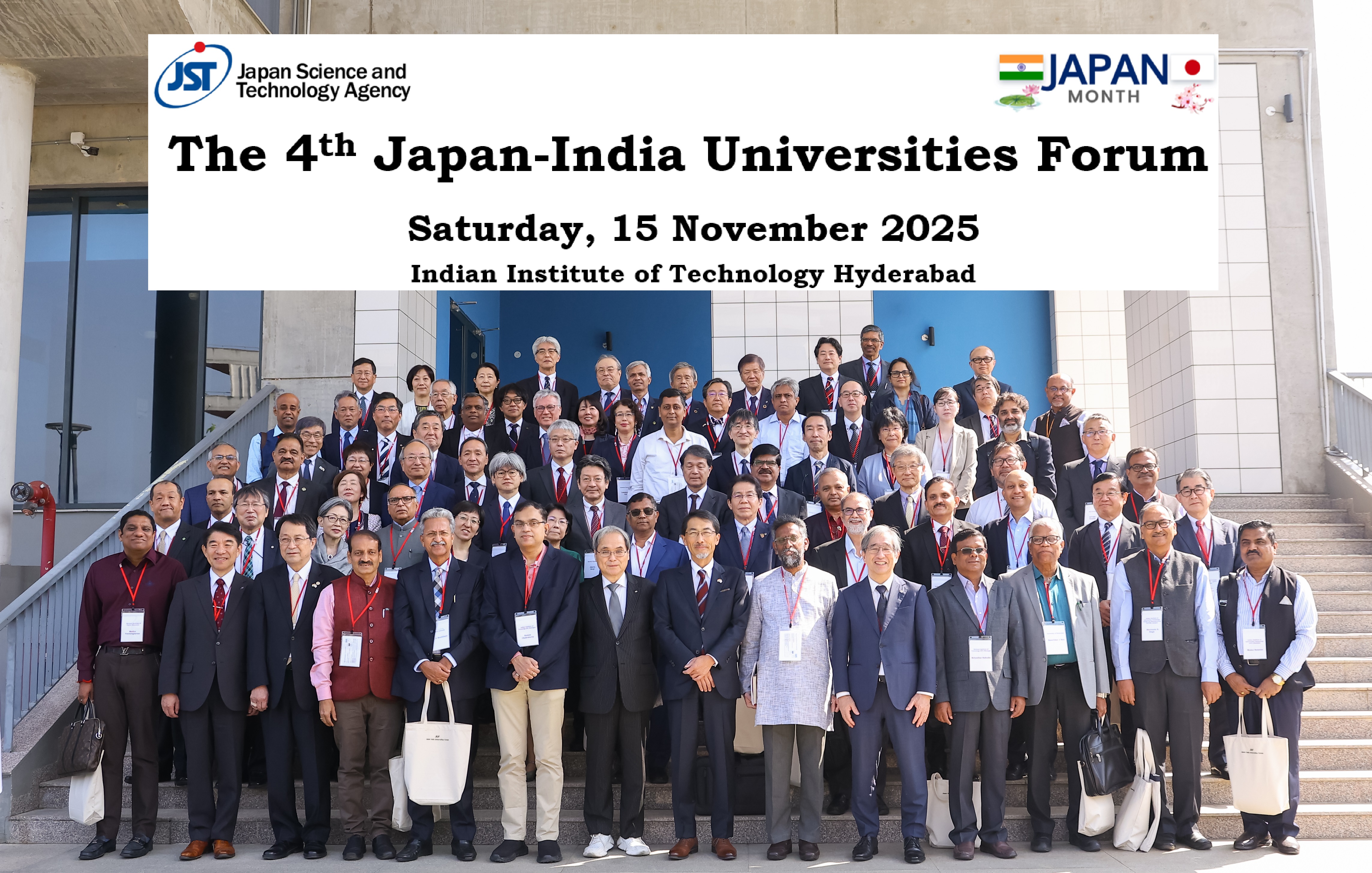 11月15日、インド・テランガナ州のインド工科大学ハイデラバード校において「第4回日印大学等フォーラム」が開催され、本学から玉置久理事・国際連携推進機構長、富永圭介分子フォトサイエンス研究センター教授、的場修次世代光散乱イメージング科学研究センター教授が出席しました。
