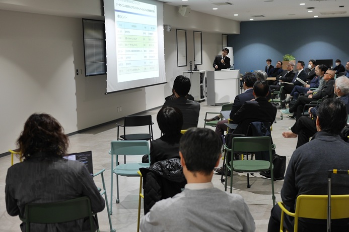 会場には、藤澤学長、喜多理事(研究担当)、河端理事(社会共創・イノベーション担当)に加え、学内教職員や企業関係者を中心とした学外者をあわせて計80名が来場しました。