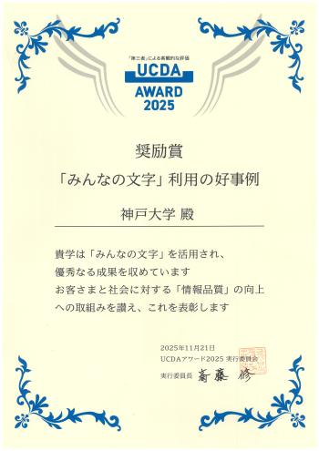 この度、本学のキャンパス案内サインが、UCDA(一般社団法人 ユニバーサルコミュニケーションデザイン協会)から提供されるUCDA認証フォント「みんなの文字」を積極的に活用している好事例として奨励賞に選ばれました。