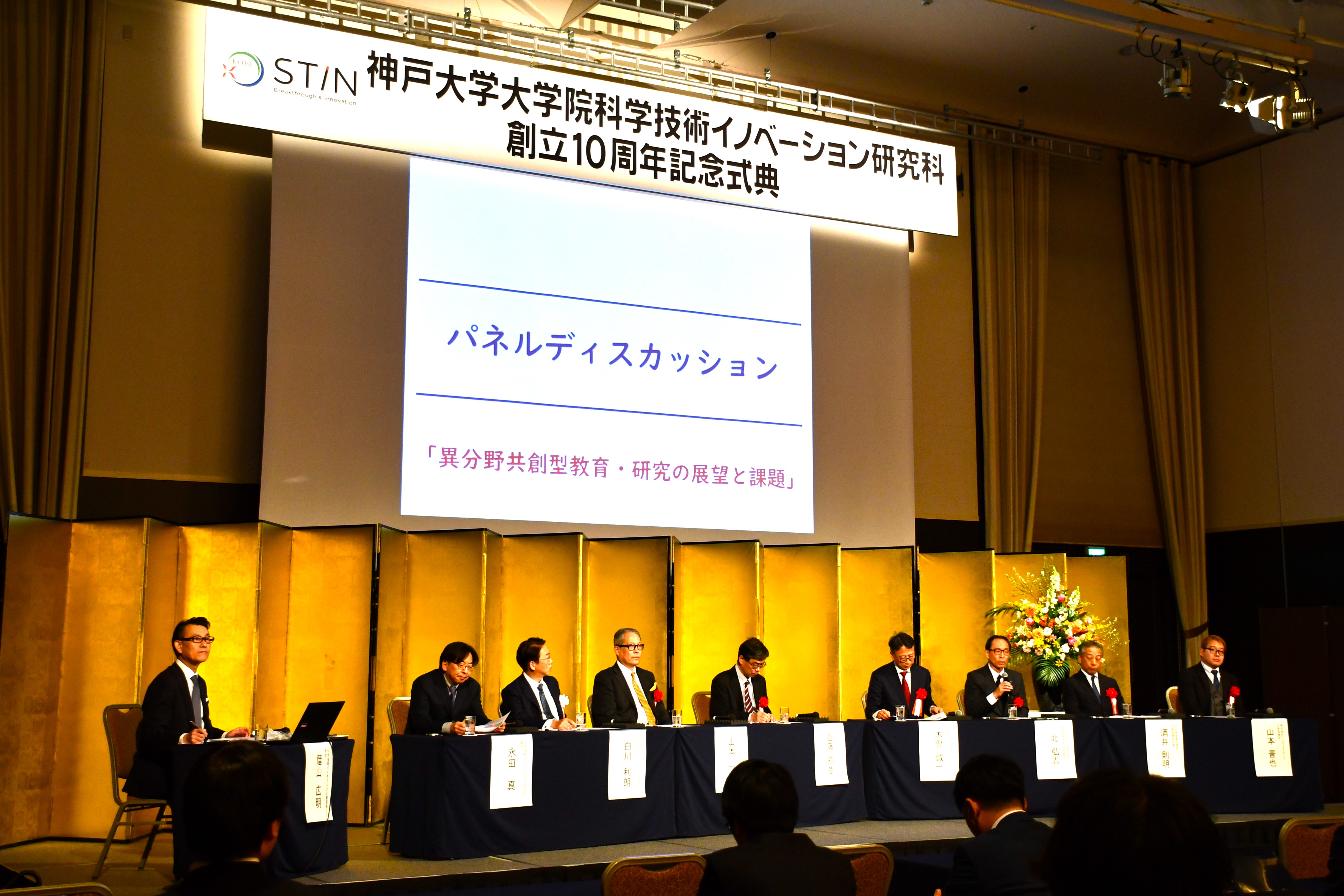 また、「異分野共創型教育・研究の展望と課題」をテーマとしたパネルディスカッションでは、京都薬科大学 理事長の木曽誠一氏、コニカミノルタ株式会社 技術顧問の北弘志氏、出光興産株式会社 代表取締役社長の酒井則明氏、株式会社Link&Innovation 代表取締役の山本晋也氏、近藤名誉教授、山本一彦氏、白川研究科長、永田真教授(科学技術イノベーション研究科)が登壇し、蔭山広明教授(同研究科)の進行のもと、活発な意見交換が行われました。