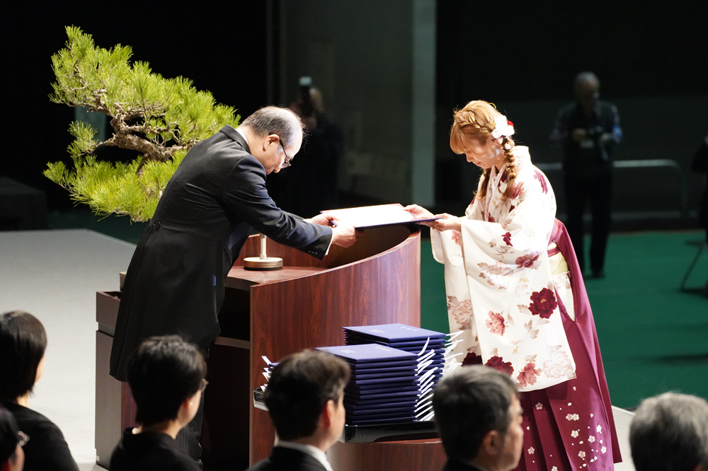 学位授与式では、藤澤正人学長が、10学部、15大学院研究科の代表に学位記を手渡しました。藤澤学長は式辞で、2025年に開催された大阪・関西万博や今年2月に日本選手団が活躍したミラノ・コルティナ冬季五輪を振り返りながら、「常に世界に目を向け、多様な価値観と出合うことこそが、新しい時代を切り拓く知の源泉です。世界の舞台で自らが目指す『最高の景色』を追い求め、歩み続けてほしい」と期待を語りました。また、生成AIやロボット、デジタル技術が急速に進展し、国際紛争や国家間の緊張が高まる予測不可能で不確実性の高い時代において何が求められているかについても触れ、「これまで本学で培ってきた学と力を存分に発揮し、世界に貢献する誉れ高き人材として揺るぎない歩みを続け、さらなる躍進を遂げられますことを心より祈念します」とエールを送りました。