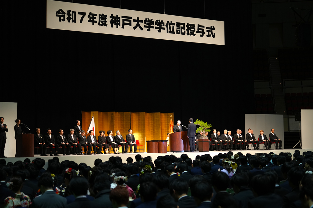 神戸大学は3月25日、令和7年度の学位記授与式(卒業式、修了式)を神戸市中央区の神戸ポートアイランドホール(ワールド記念ホール)で行いました。学部卒業生2502人に学士、大学院博士前期課程修了生1189人と法学研究科および経営学研究科の専門職学位課程修了生77人の計1266人に修士の学位が授与されました。また大学院博士後期課程の225人が修了、論文博士の10人を加えた235人に博士の学位が授与され、総勢4003人が巣立ちの春を迎えました。