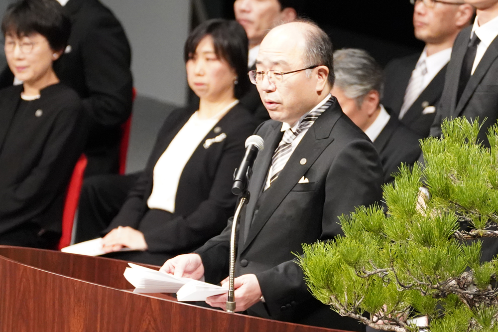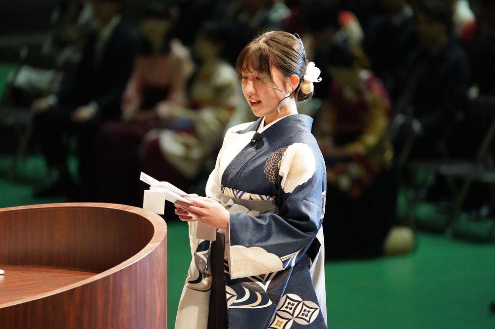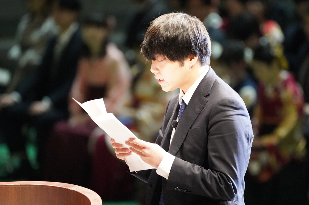 これに対して、卒業生を代表し、国際人間科学部の金原麻衣さんが「今日、学生生活の節目を迎えると同時に、新たな『挑戦』への第一歩を踏み出します。それぞれが選んだ場所で自らの可能性に挑み続け、社会の中で役割を果たしながら、未来へ新たな価値を生み出していきます」と答辞を読み上げました。また、修了生を代表して大学院経営学研究科の米田晃さんが「生成AIが発展し、極端な思考がはびこる現代社会において、周囲の課題に常に目を向け、正しい知識と創造性をもって、これからより良い社会を作るよう努力することが、私たち神大修了生に与えられた使命であると確信しています。その使命を胸に刻み、これからも精進します」と力強く決意を口にしました。