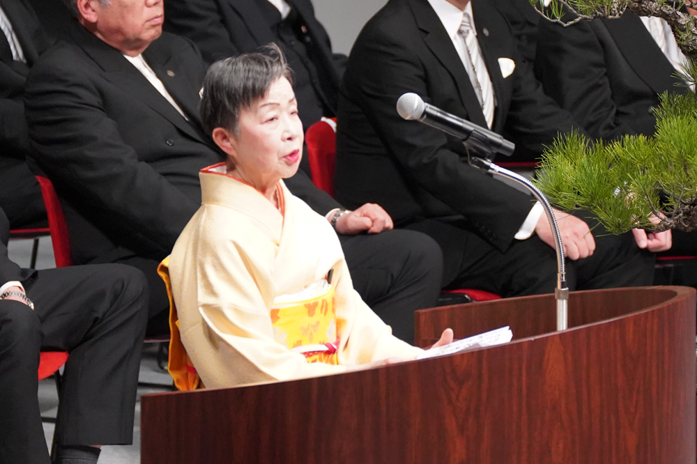 続いて校友会の藤森陽子副会長が「本学には9つの同窓会が存在し、2022年の創立120年を機に『神戸大学校友会』も発足しました。誇るべき先輩方や、同窓生、そして母校を頼りにし、卒業してからもそのつながりを深めていただきたい。私たちはいつも、いつまでも皆さんの背中を見守っています」と祝辞を述べました。