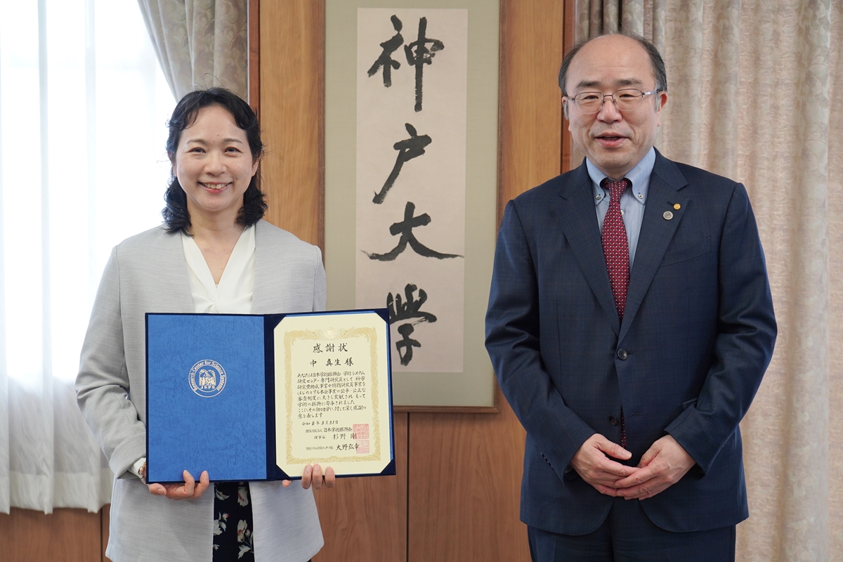 本学人文学研究科の中 真生教授が2026年3月末に、日本学術振興会学術システム研究センター専門研究員としての任期満了を迎え、これまでの貢献に対して日本学術振興会および同学術システム研究センターから感謝状が贈られました。藤澤正人学長が4月20日、中教授に感謝状を手渡しました。