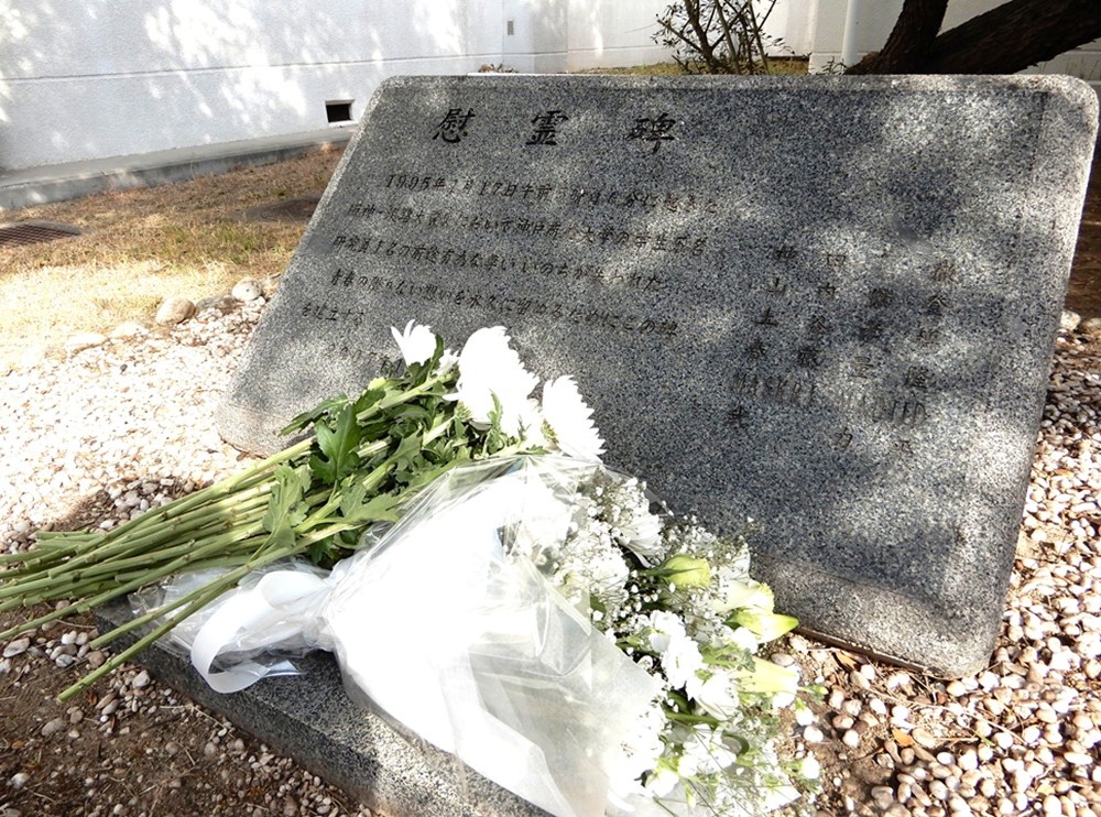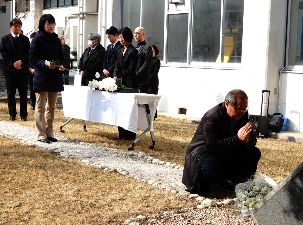 深江キャンパスでも午後零時半、練習船「海神丸」の汽笛が鳴り響く中、教職員ら約30人が黙とう。慰霊碑に献花し、手を合わせました。