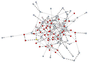 青:健全な銀行、黄:震源となる破綻銀行、赤:連鎖破綻した銀行、薄赤:優先度の低い債務の返済が滞った銀行をそれぞれ示す。