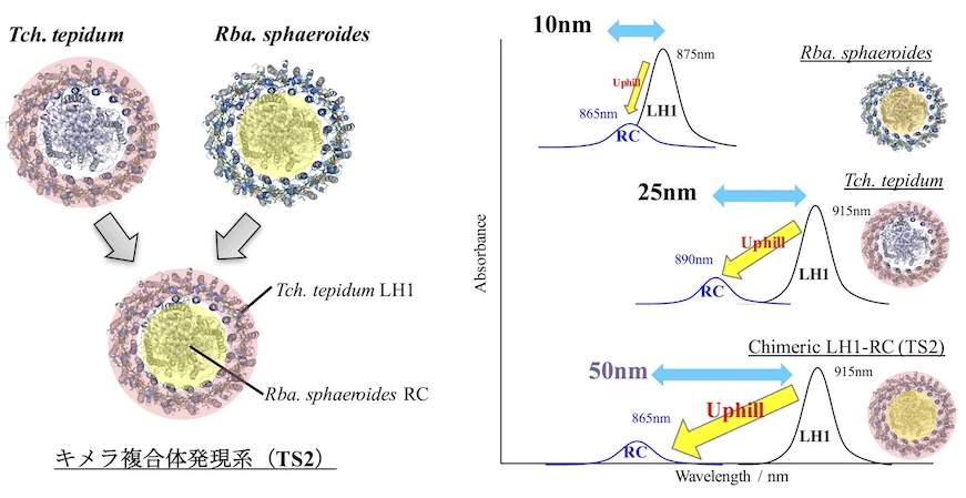 Rba. sphaeroides のORF※2に Tch.tepidum のLH1の遺伝情報を導入することにより、LH1が Tch.tepidum、RCが Rba.sphaeroides であるキメラ複合体発現系を構築できる可能性があります。このキメラ複合体発現系では Tch. tepidum よりも大きなuphill型のエネルギー移動が起こるため、分子機構に関する重要な知見が得られることが期待されています (図1)。