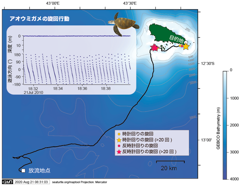 - 幅広い分類群の大型海洋動物 (サメ、ウミガメ、ペンギン、オットセイ、クジラ) が旋回行動をしている (クルクル回る) ことが明らかとなった