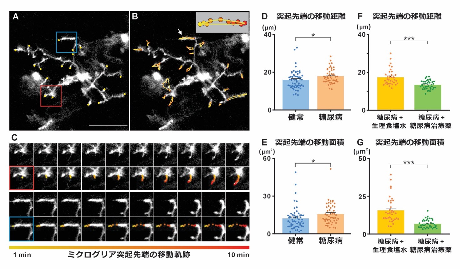 D・E:健常マウスと糖尿病マウスを比較すると、糖尿病において突起先端の移動距離や動いた面積が小さくなっている。