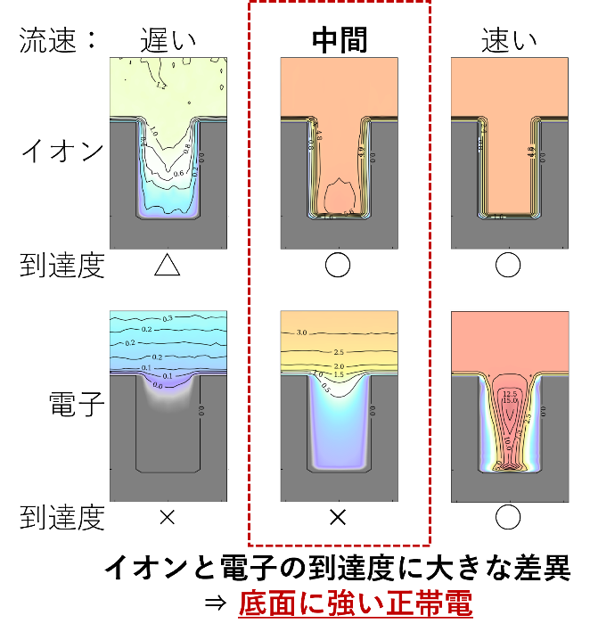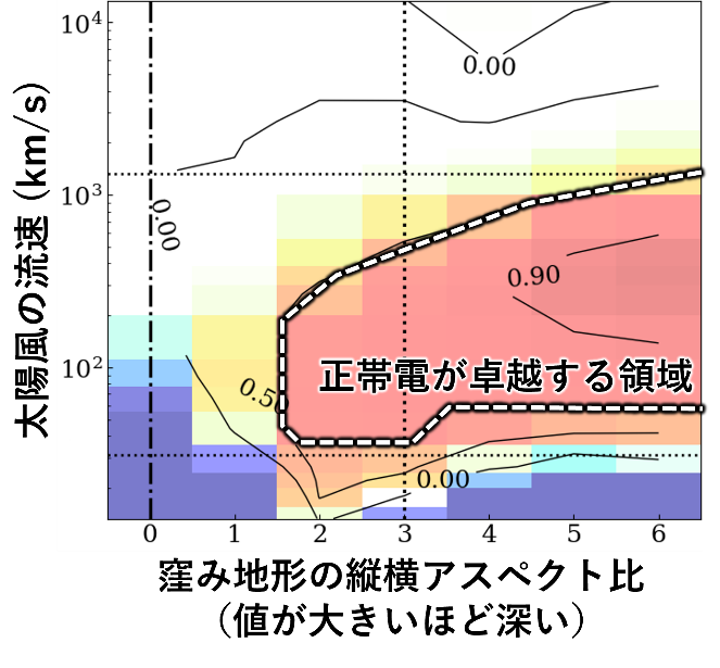 その結果、太陽風速度が非常に①「遅い条件」と非常に②「速い条件」では、顕著な静電気の蓄積は見られず、その③「中間の速度条件」においてのみ、窪み地形底部に顕著な正電荷の蓄積が認められました。これは①の「遅い条件」ではイオンと電子の両者が窪みの内部に侵入できないのに対し、③の「中間の速度条件」ではイオンのみが窪みの内部に侵入できることに起因します(図1)。ちなみに②の「速い条件」では、イオンと電子の両者が窪みの内部に侵入できるため、お互いが電荷を打ち消し合うことで底部の電荷蓄積は抑制されます。なお平均的な太陽風パラメータとされる400 km/sの流速、10 eVのプラズマ温度は、今回分類した3つの条件の中では、③「中間の速度条件」に対応します(図2)。当該条件では、プラズマデバイ長(およそ10 m)未満の小さな開口部を有する窪みの底部において、最大で+700 Vの電圧に達する可能性も示されました。