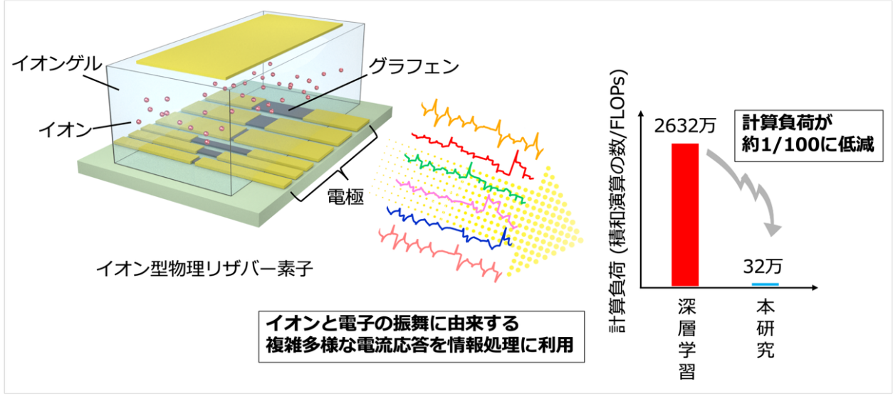 今回、NIMS、東京理科大学、神戸大学からなる研究チームは、イオンを利用する物理リザバー素子を開発し、深層学習並みの高い計算性能と桁違いに低い計算負荷を実現しました。高い電子移動度や両極性をもつグラフェンと、イオンゲルを組み合わせることで、速度が異なる様々な反応(イオンと電子が様々な形で動く)が複雑に関係しながら進むため、非常に広い範囲で時定数が異なる(変化速度が異なる)入力信号に対応が可能となります。その計算性能は、従来型物理リザバーの中でも最も高い計算性能を示し、ソフトウェアで実行した深層学習と同等の計算性能でありながら、計算負荷を約100分の1まで低減することに成功しました(図1)。