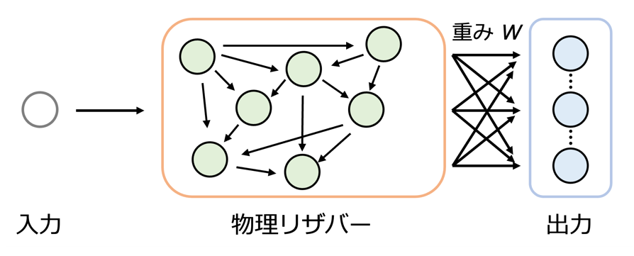 計算機による処理の代わりに「物理リザバー」を用いてリザバーコンピューティングを実行する手法。物理リザバーコンピューティングでは、入力を非線形変換してリザバー状態を出力する過程(非線形変換)は物理リザバーで行われ、出力重みの線形結合によって回答を出力する過程(線型結合)のみ外部の計算機を用いて行われます。従来の計算機を用いたリザバーコンピューティングでは、線形結合による出力計算はごくわずかな計算資源(計算ステップ数、メモリ使用量)で実行できるのに対し、非線形変換を行う際には大きな計算資源が必要となります。一方、物理リザバーコンピューティングでは、非線形変換を物理リザバー内部で起こる物理現象を利用して実行するため、計算資源を節約でき、消費電力を大幅に低減することが可能です。