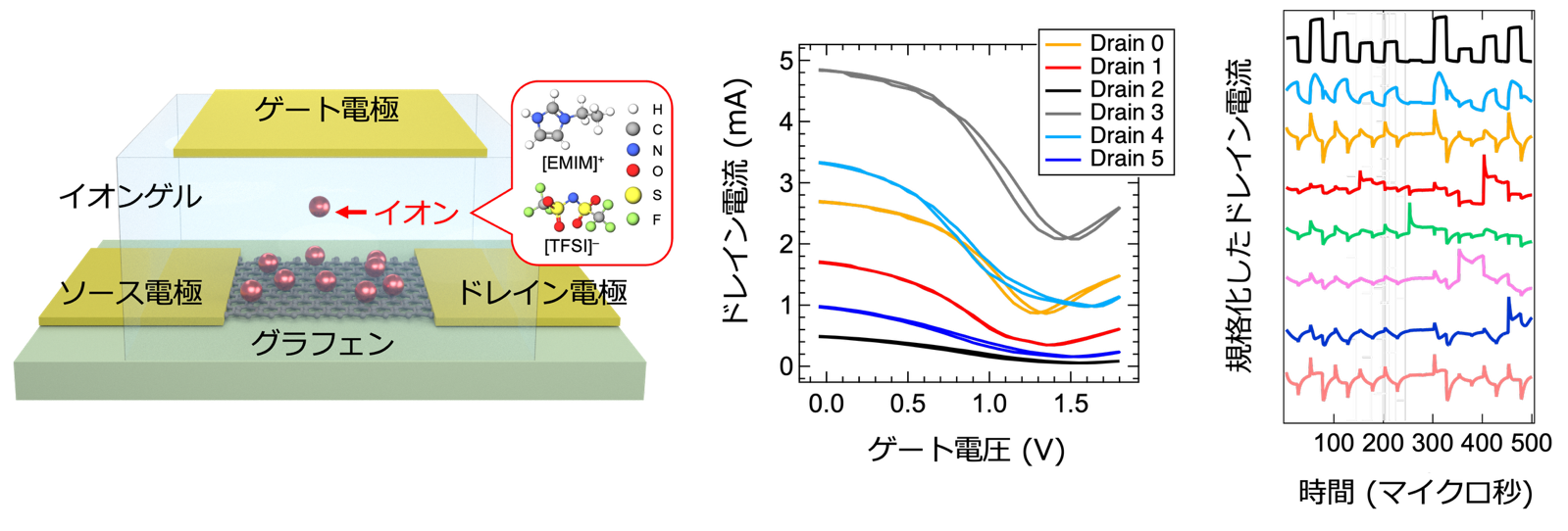 - 研究チームは、これまでの材料・デバイスでは解決されなかった、低い計算性能や情報処理可能な時間スケールの幅の狭さという課題を、グラフェン(5)とイオンゲル(6)を用いる電気二重層トランジスタ(EDLT)の電気応答に基づく新しいイオントロニクス(7)型物理リザバーコンピューティングで解決しました。チャネル材料にグラフェン、電解質にイオンゲル(EMIm-TFSI)を用いて作製した電気二重層トランジスタ(EDLT)を図3(右)に示します。このEDLTのゲート電極に電圧を印加すると、イオンゲル内部でイオンが移動します。このとき、グラフェン/イオンゲル界面近傍での電気二重層(8)によってグラフェンの電子キャリア密度が変化するため、グラフェンを流れるドレイン電流(図3(左)でドレイン電極→ソース電極間に流れる電流)を制御することができます[図3(中)]。パルス状の電圧を印加することによって電気二重層の充放電が起こりドレイン電流が過渡応答を示しますが[図3(右)]、電気二重層の充放電だけでなく分子吸着、電荷トラップなどを含む、イオンと電子の複雑な振る舞いに起因して、時定数100ナノ秒(1000万分の1秒)ほどの高速応答から数10ミリ秒(100分の1秒)の低速応答を含む5桁に及ぶ幅広い応答時定数領域と、グラフェンの両極性輸送に由来する高い非線形性[図3(中)]という物理リザバーコンピューティングに好適な諸特性を示しました。本素子のこれらの特性は、物理リザバーの課題とされた処理できる時系列情報の時間スケールの狭さを大きく改善し、生体信号をはじめとする多様な時系列情報の解析において、幅広い時間スケールに対応できるだけでなく、信号に含まれる様々な周波数成分の特徴を効果的に抽出・認識する上で有用であることを示しています。