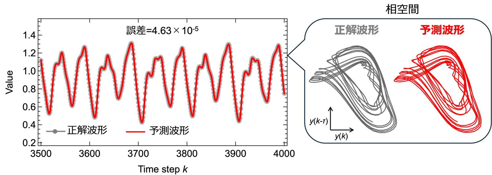- 本素子を用いた物理リザバーコンピューティングを用いて、典型的なベンチマーク試験であるMackey-Glass方程式予測タスク(9)を実施しました。実験では、Mackey-Glass方程式から得られる現在の情報を電極に入力してイオンを駆動し、対応するドレイン電流の時間変化を6個のドレイン電極で測定しました。得られた電流値と出力重みの線形和を用いて、Mackey-Glass方程式に基づき1ステップから10ステップ先の未来状態を予測しました。図4には、1ステップ先の未来を予測した結果を示しています。正解波形と予測波形が非常に良く一致し、正解との誤差は4.63×10-5と極めて小さく(試験)、99 %以上の高精度で予測できました。より困難な10ステップ先の未来の予測について既存の物理リザバーと比較したところ、最も高い計算性能であることがわかりました。さらに、ソフトウェアを用いた高性能な深層学習と同等の予測精度を得られた上に、その際に必要な計算負荷が約100分の1に低減されました(図1)。