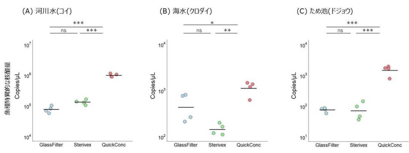 「QuickConc®」は、すべての水環境において、従来法よりも有意に高い量のDNAを回収しました。種特異的なDNAの量を比較したところ、従来法に比べて5倍から10倍の収量が確認されました(図2.)。
