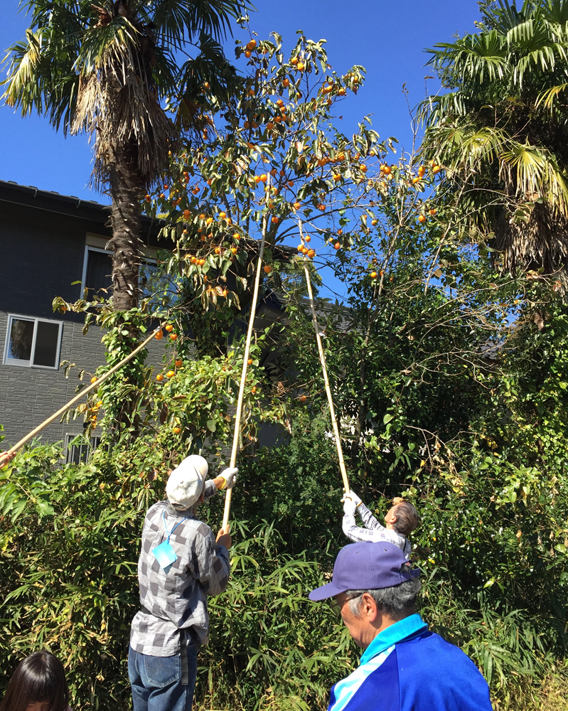 秋になると「さる×はた合戦」という地域交流型イベントを実施し、住民や参加者が力を合わせてカキを収穫します。サルはカキの実を食べに里に下りてきますが、早期に一斉収穫すると、その場所にはもう来なくなります。この取り組みによって、畑地区を訪れる人が増えたり、住民の意欲が高まったりする効果もあり、全国的に注目されています。