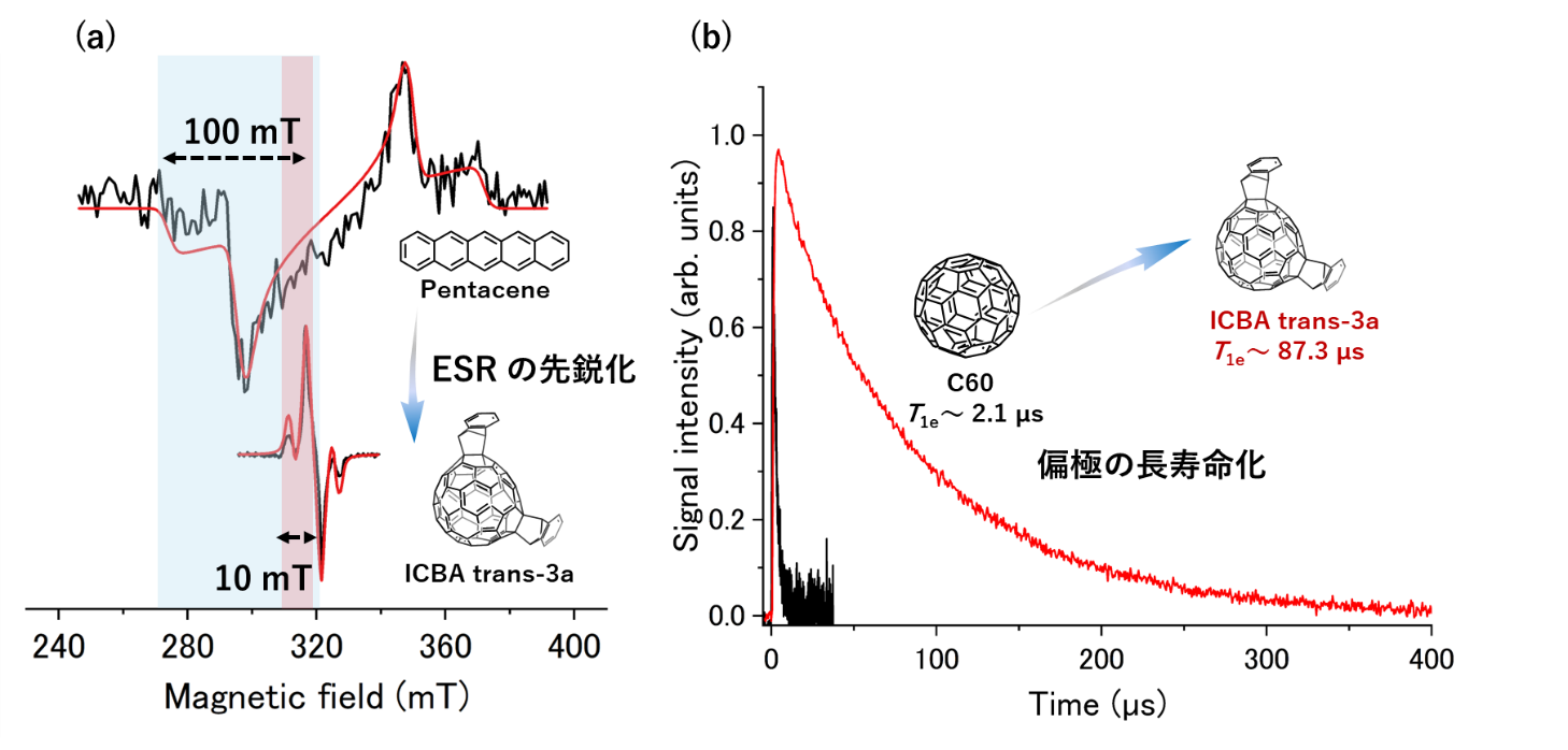 - フラーレンへの化学修飾により擬回転を抑えることで、電子スピン偏極の緩和の課題を克服した。