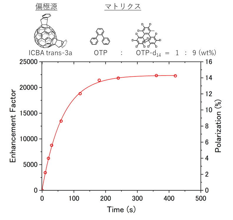その結果、フラーレンに二つのインデン置換基を導入した誘導体(ICBA)で擬回転が効果的に抑えられることが分かりました。特に、ICBA trans-3a異性体において偏極状態を大幅に長寿命化することに成功しました(図1)。先鋭なESRと長い偏極寿命を両立したフラーレン誘導体を偏極源として用いることで、ペンタセンと比較して約21倍のトリプレットDNPの高効率化を達成しました。また、アモルファス材料中で初めて実用化レベルとされる10%を超える14.2%という高い偏極率(増感倍率22,000倍)を得ることに成功しました(図2)。
