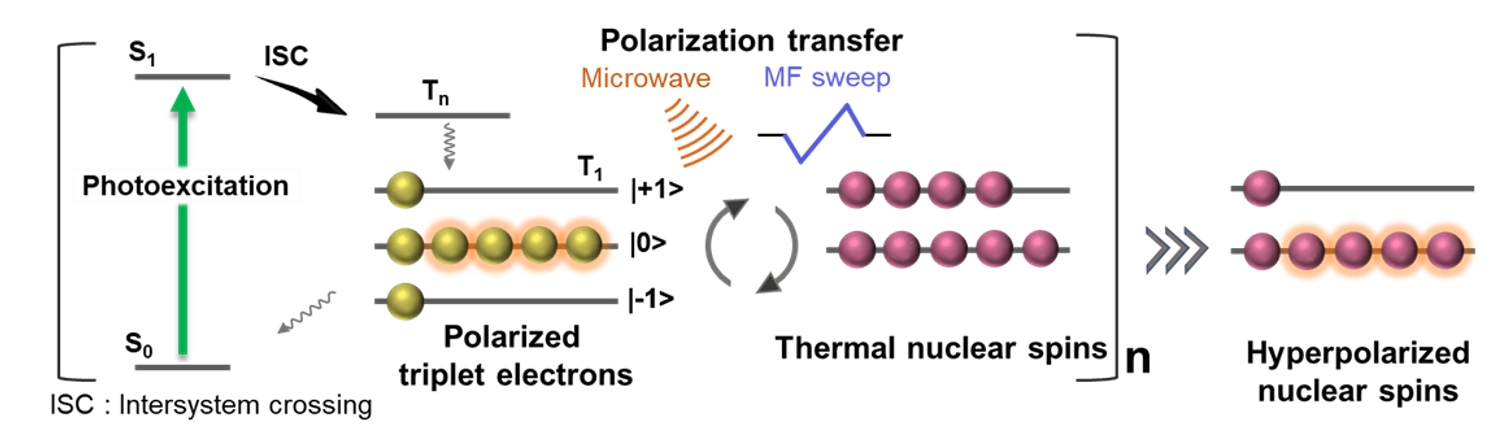 偏極源の光励起(Photoexcitation)により生成する三重項電子スピンは、複数のスピンが一つの準位に大きく偏った高いスピン偏極(Polarized triplet electrons)を持っています。このスピン偏極をマイクロ波(Microwave)照射と磁場掃引(MF sweep)によって核スピンへ移す(Polarization transfer)ことで、超核偏極状態(Hyperpolarized nuclear spins)を作り出します。