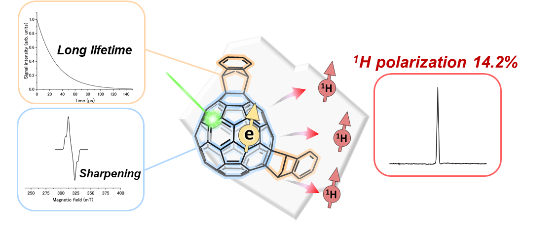 東京大学大学院理学系研究科の坂本啓太大学院生、濱地智之大学院生(現 九州大学先導物質化学研究所 助教)、楊井伸浩教授らの研究グループは、京都大学大学院理学研究科の御代川克輝大学院生、倉重佑輝准教授、京都大学大学院工学研究科の今堀博教授、理化学研究所開拓研究所および仁科加速器科学研究センターの立石健一郎研究員、上坂友洋主任研究員・兼部長、神戸大学分子フォトサイエンス研究センターの小堀康博教授らと共同で、トリプレットDNP(注1)の新規偏極源分子としてフラーレン誘導体(注2)の開発を行うことで、高効率なトリプレットDNPを実現しました。