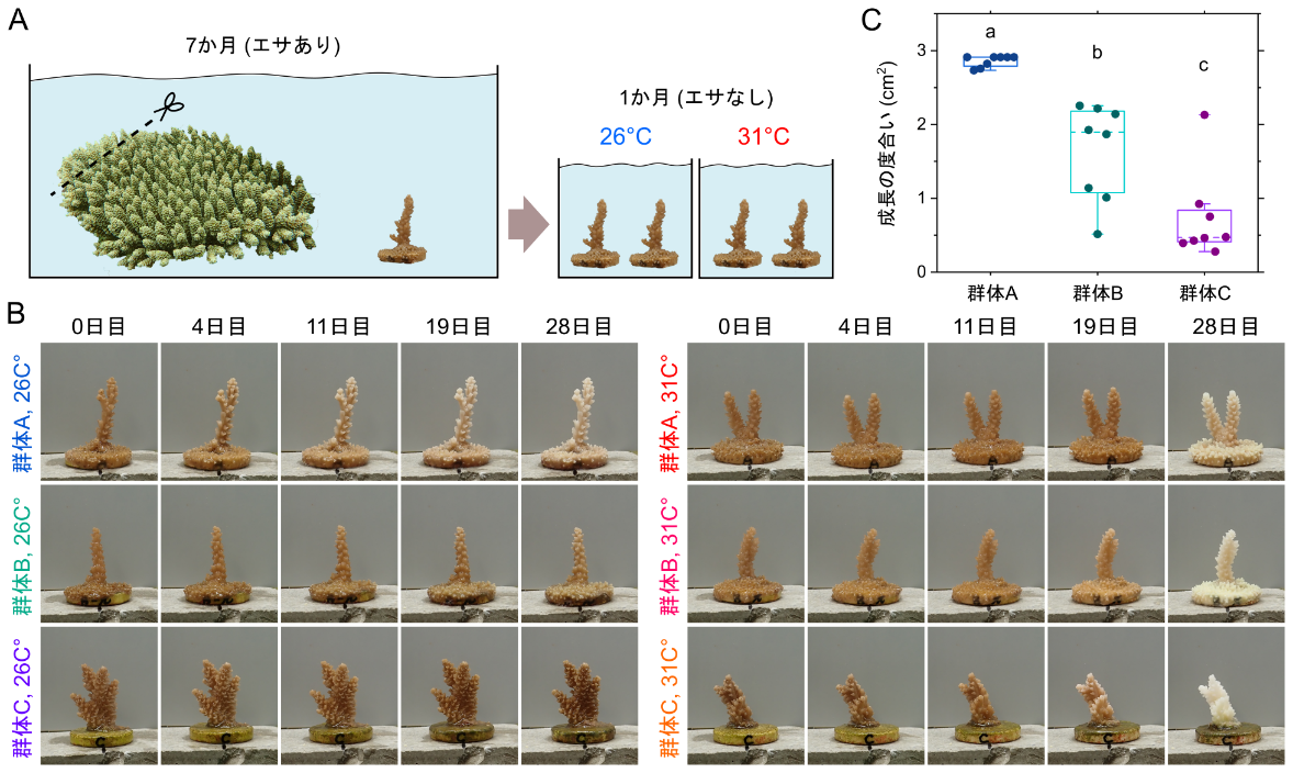 - 栄養不足での白化の進み方にはサンゴごとに違いがあり、成長が速いものほど白化しやすい傾向が見られました。この白化は、サンゴが共生藻を食べてエネルギーを確保する適応戦略である可能性があり、必ずしも衰弱の兆候ではありません。