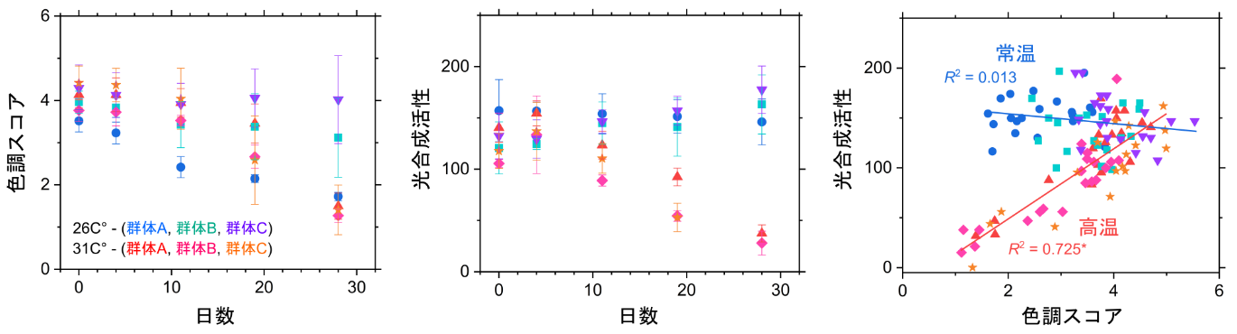- 高温で起きる白化は、サンゴ共生藻の光合成系が壊れることで起こります。一方で、栄養不足で起きる白化は、光合成が正常なまま進行することがわかりました。