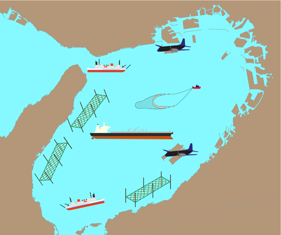 大阪湾は日本有数の大都市・大阪と神戸に隣接し、1,000万人以上の生活圏を支える海域です。商業漁業、レジャー漁業、埋立をはじめとする海洋開発、船舶交通など、さまざまな人間活動が集中しています(図1)。また、大阪湾では、市民からの情報や新聞などの記事において、イルカが観察されることが報告されていますが、科学的な調査はこれまで行われてきませんでした。そこで本研究では、都市化された海域において、イルカと人間活動の関係を調べることを目的とし、大阪湾において音響調査を実施しました。