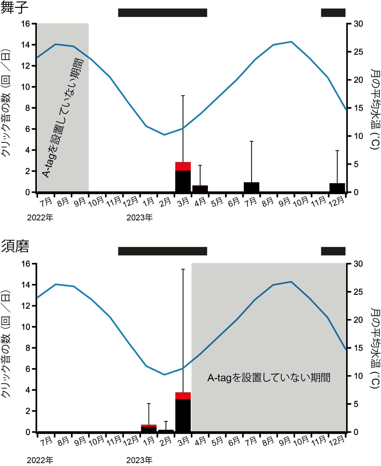 本研究では、明石海峡周辺の2地点(神戸市舞子および須磨)に受動的音響観測機「A-tag」を設置し、約1年半にわたって合計13,000時間以上の音響データを取得しました(図2)。A-tagはイルカ類が発する鳴音(クリック音注2)を検出し、その記録からイルカの存在や採餌イベントを推定できる機器です。得られたデータを解析することで、マイルカ科とネズミイルカ科のクリック音に分類できます。
