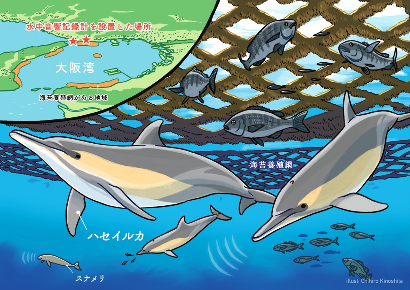 神戸大学大学院海事科学研究科の岩田高志助教、松本大一氏(研究当時:大学院生)、荒木陸秀大学院生、海洋研究開発機構の小川真由特任研究員 (研究当時:京都大学大学院農学研究科)、早稲田大学ナノ・ライフ創新研究機構の赤松友成研究院教授、京都大学東南アジア地域研究研究所の木村里子准教授らの研究グループは、大阪湾の明石海峡周辺海域において、イルカが冬から春にかけて時々出現していることを、1年間以上にわたる受動的音響モニタリング注1で明らかにしました。イルカの出現は、海苔(ノリ)養殖が行われる季節と一致しており、イルカが人間活動によって一時的に生態系が豊かになった海域を利用している可能性が高いことが分かりました。日本有数の海上交通量を誇る明石海峡において、夜間を中心にイルカが採餌をしていることもわかり、高度に都市化された海域でも、海生哺乳類と人間活動が共存しうる可能性が示されました。この研究成果は、2026年1月12日に『Aquatic Mammals』にオンライン掲載されました。
