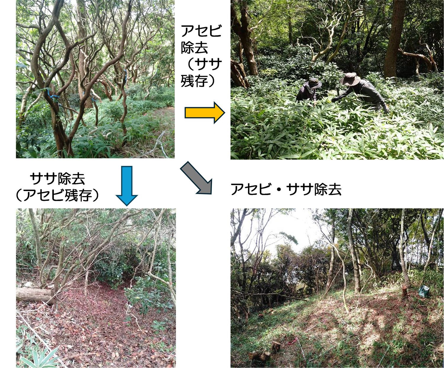 管理放棄された二次林注1では、特定の下層植物が優占し、光環境や土壌条件を変化させ、樹木の更新を阻害します。アセビやササ類は、土壌の有機物層注2や菌類群集に強い影響を与えることが知られていますが、これらの植物の刈り取り管理の効果については定量的データが依然として不足していました。