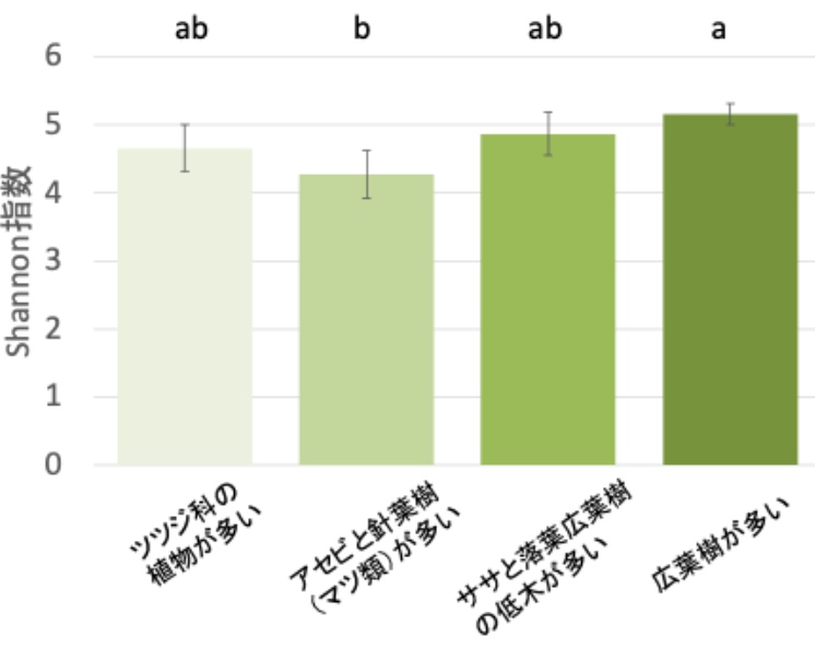 図2.樹種構成の異なる4つの森林プロット間の土壌菌類群集の多様性指数(Shannon 指数)の比較